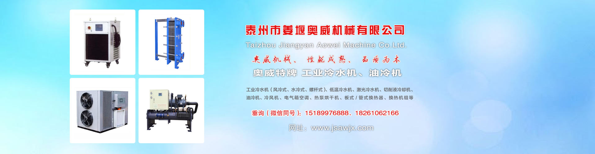 主要產品有:冷水機,油冷機,工業(yè)冷水機,低溫冷水機,風冷式冷水機,水冷式冷水機,螺桿式冷水機,工業(yè)冷油機,激光冷水機,切削液冷卻機,工業(yè)冷風機,熱泵烘干機,電氣箱空調,換熱器等。10余類產品,600多個規(guī)格型號。